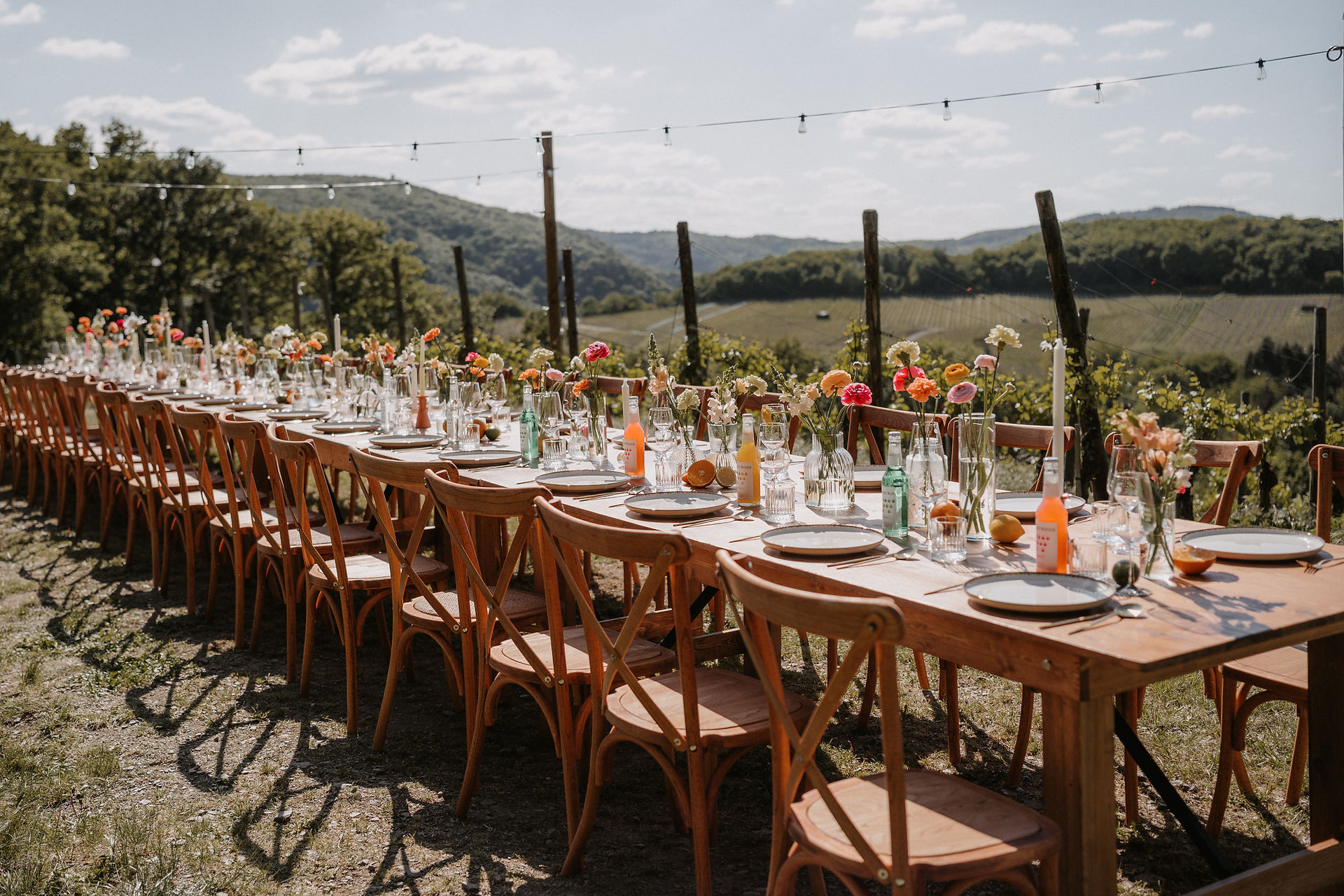 aufgebaute Tafel mit Bestuhlung & Deko zwischen Weinreben