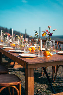 Zwischen Reben und Aussicht, auf rustikalen Holztischen mit liebevoller Deko, empfangen wir Gruppen ab 16 Personen für ein unvergessliches Erlebnis.